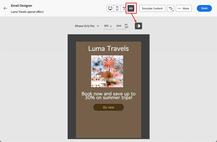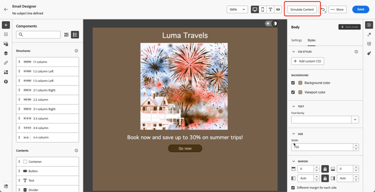 若要存取電子郵件Designer中的深色模式,並取得預設深色模式設定的預覽,請遵循下列步驟。