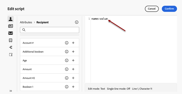 使用二進位格式時,特殊值「 」(空字串)、「null」和「undefined」會完全停用欄位,而不會擲回錯誤。 在這三種特殊情況下,完全不會傳遞標籤。 這允許在個人化欄位中使用精心編制的Javascript時,僅針對某些訊息傳遞特定的TLV。