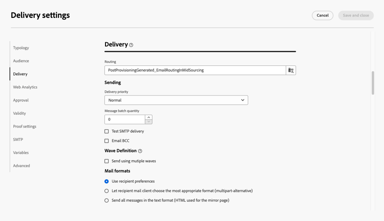 使用收件者偏好設定 (預設模式):電子郵件格式是根據儲存在收件者設定檔中的資料所定義。 如果收件者希望以特定格式接收電子郵件,則此格式為傳送的格式。 如果未填入欄位,則會傳送替代的多重部分電子郵件(請參閱下文)。