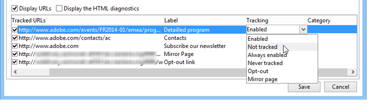 此外,您可以在 Category 欄的下拉式清單中,為每個追蹤的URL選取類別。 這些類別可顯示在報表中,例如在 URLs and click streams 報表中(請參閱此區段)。 類別是在特定列舉中定義: urlCategory。 在本節中進一步瞭解如何使用分項清單。