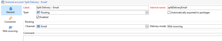 為此,在為每個管道布建時,會建立具有 Split 路由模式的其他外部帳戶: