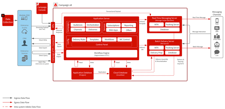 在其FDA部署中,Adobe Campaign v8可連線至Snowflake,以透過同盟資料存取功能存取資料:您可以存取及處理儲存在Snowflake資料庫中的外部資料與資訊,而不需要變更Adobe Campaign資料的結構。 PostgreSQL是主要資料庫,您可以使用Snowflake做為次要資料庫,以擴充資料模型並將資料儲存至Snowflake。 接著,您可以利用出色的效能,對大型資料集執行ETL、細分和報告。