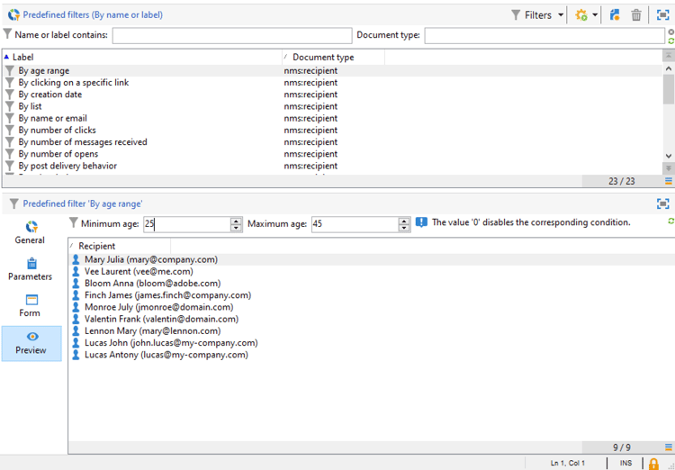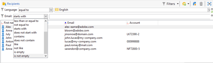 %@gmail.com,以顯示具有Gmail地址的所有設定檔。 在[姓氏]欄位中輸入%@L以顯示所有姓氏中帶有L的設定檔。若要變更收件者清單的預設篩選器,請瀏覽至 Profiles and Targets > Predefined filters 節點。