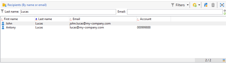 每個清單上方的欄位可讓您針對此清單使用 預先定義的預設篩選器。 對於收件者清單,您可以依預設篩選名稱和電子郵件地址。