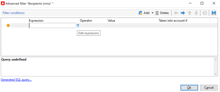 若要執行進階篩選功能,請使用函式來定義篩選器的內容。 進階篩選器編輯器運用Campaign查詢編輯器的所有功能。