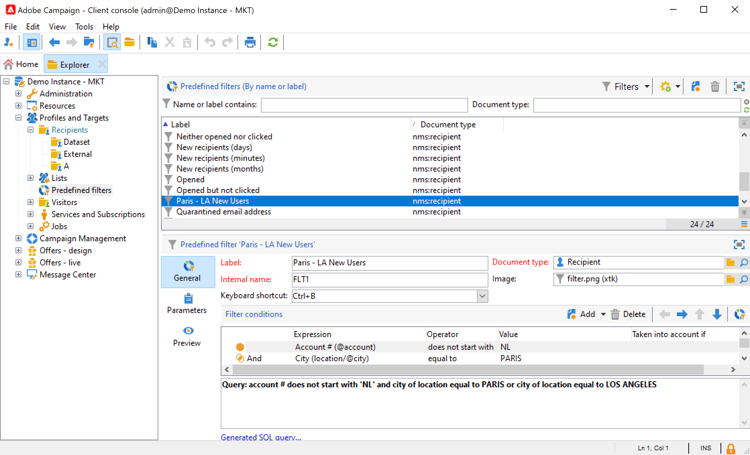 定義篩選條件。 在以下範例中,您將篩選帳號並非以NL開頭的收件者,以及住在巴黎或洛杉磯的收件者。
