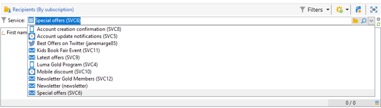 依預設,Adobe Campaign會顯示操作員有權讀取的所有資料庫記錄。 您可以使用瀏覽器視窗上半區段中可用的選項來篩選此資料。
