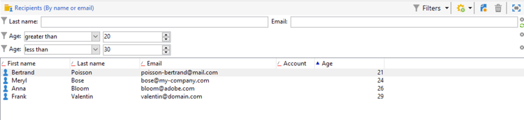以滑鼠右鍵按一下收件者清單中的 年齡 欄,然後選取 Filter on this column。