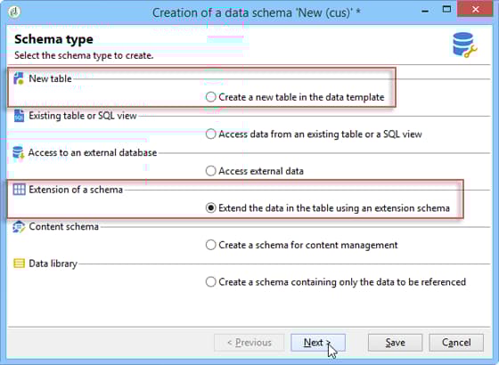 若要新增Adobe Campaign中不存在的全新資料型別(例如合約表格),您可以直接建立自訂結構描述。