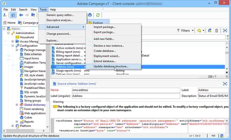 並以 XML 描述了應用程式中資料的實體和邏輯結構。它遵循Adobe Campaign特有的語法,稱為結構描述。