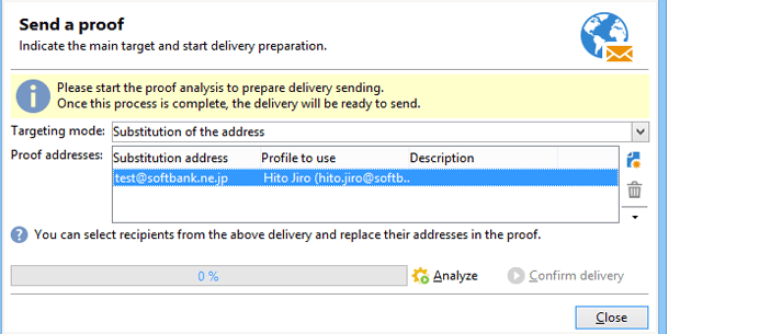您可以傳送校樣以測試您的傳遞。 當您傳送證明時,如果您使用替代地址,請輸入與所使用設定檔的電子郵件格式對應的地址。