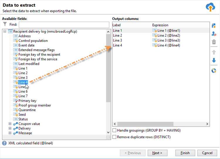 直接郵件傳遞的輸出檔案會在傳遞分析期間產生。 檔案的內容取決於選取的輸出欄(請參閱此區段檔案)。