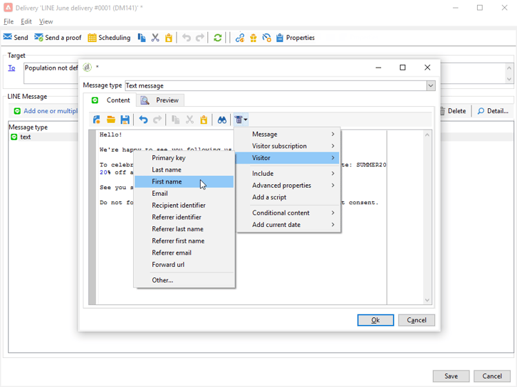 在傳遞編輯器中,選取 To 以定位LINE傳遞的收件者。 在 Visitor subscriptions (nms:visitorSub) 上執行目標定位。