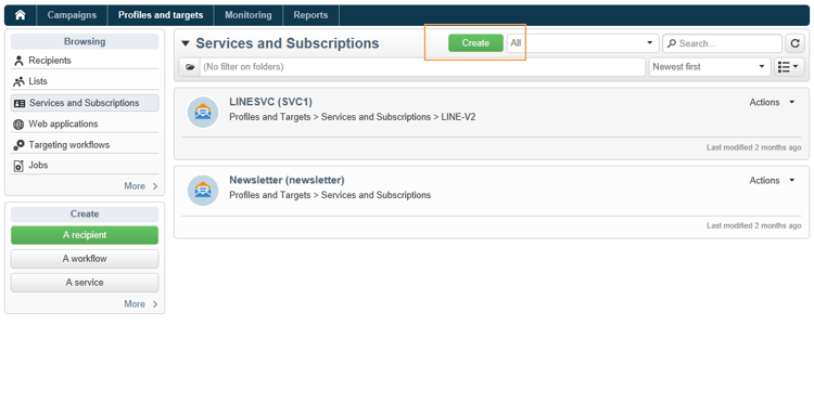 從 Campaigns 索引標籤中,選取Deliveries,然後按一下 Create 按鈕。