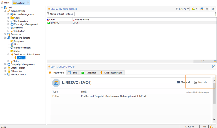 若為LINE服務報告,請從 Profiles and Targets 索引標籤存取功能表Services and Subscriptions > LINE-V2 > Explorer。 然後按一下 Reports 服務中的LINE圖示。