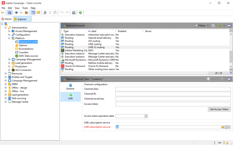 建立LINE服務後,您需要在Adobe Campaign上設定LINE外部帳戶: