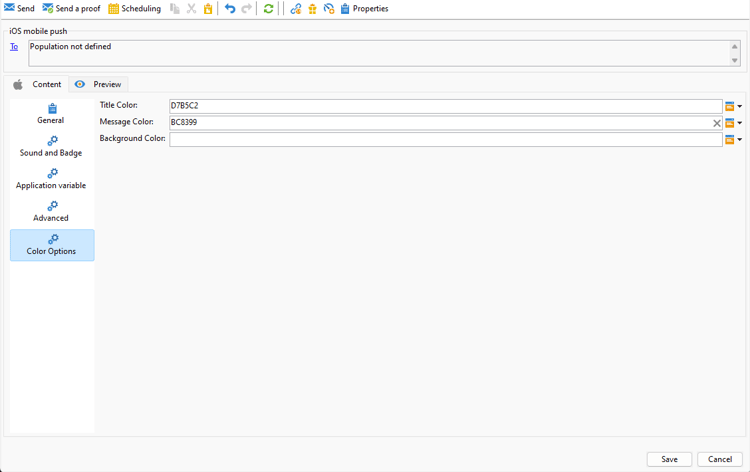 在 Color options 功能表中,輸入 Title、Message 和 Background 的十六進位色彩代碼。