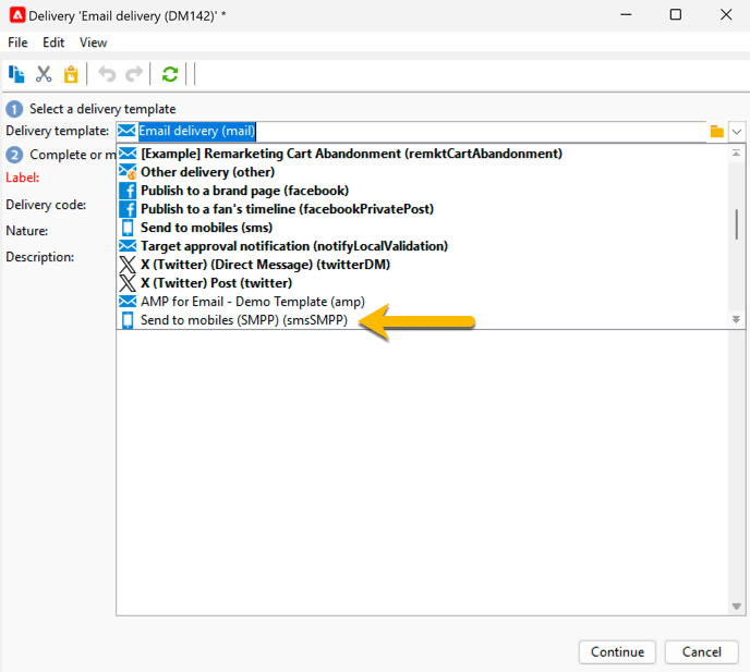 建立新的傳遞,並選取您為簡訊傳送建立的簡訊傳遞範本。