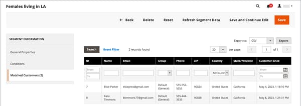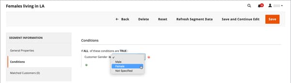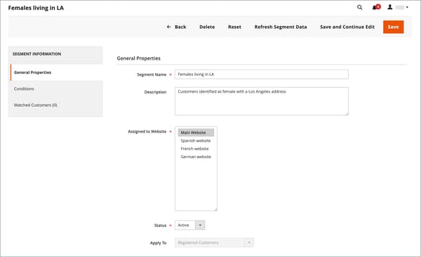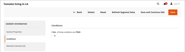 建立客戶區段類似於建立購物車價格規則,只是選項包含客戶區段特定屬性。