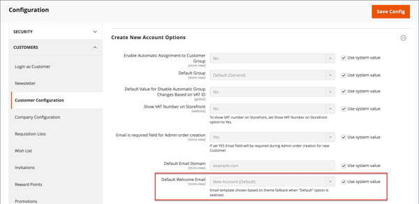 Currently Used For 階層連結軌跡會顯示範本的使用位置。 在此範例中,範本設定位於 Customer Configuration 頁面、Create New Account Options 區段和 Default Welcome Email 欄位中。