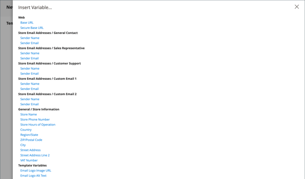 雖然商店電子郵件地址變數是最常包含在標題中的變數,但您可以直接在範本中輸入任何系統或自訂變數的程式碼。
