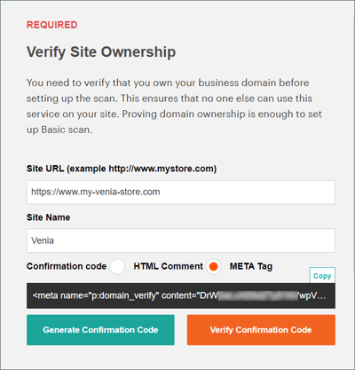 返回Commerce帳戶中的 Security Scan 頁面,然後按一下 Verify Confirmation Code 以建立網域的所有權。