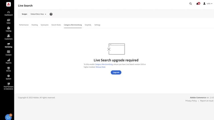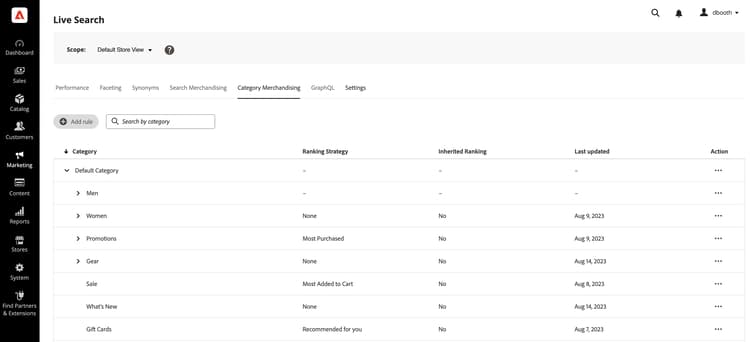 此功能可在管理員的下列位置存取: 行銷 > SEO和搜尋> Live Search > 類別銷售。