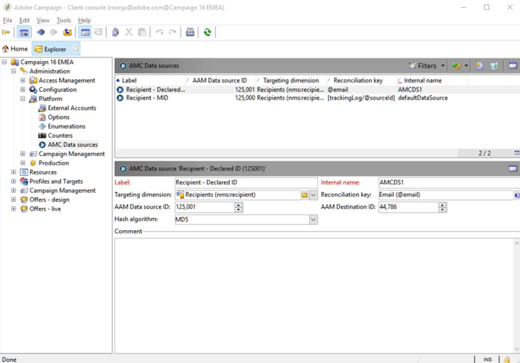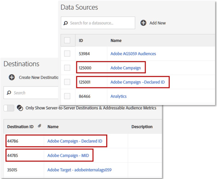 然後會在Adobe Campaign中設定資料來源。將在Adobe Campaign UI中建立兩個資料來源:一個以宣告ID或雜湊客戶ID為基礎,另一個以Marketing Cloud ID或請求者UUID為基礎。與每個ID對應的目的地ID會新增至個別欄位。例如,AAM目的地Adobe Campaign — 宣告ID的目的地ID會以調解金鑰作為雜湊客戶ID新增至資料來源設定中。 ​8. 追蹤網站上的使用者行為。