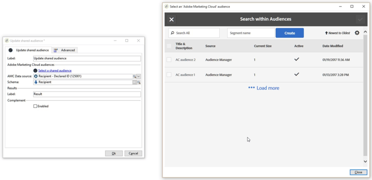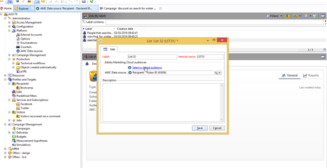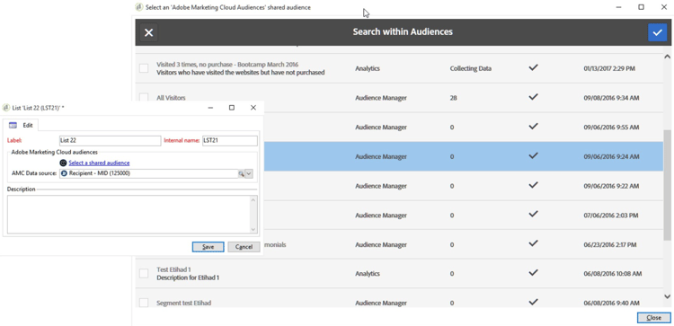 若要與行銷活動共用AMC對象,在AAM中建立區段後,必須在Adobe Campaign中完成設定。首先,在Adobe Campaign中建立共用受眾,然後從區段清單中選取AMC區段。必須根據MID和campaign中的宣告ID來建立兩個共用對象。完成設定後,這些區段就會顯示為自動對應至AAM中的個別目的地。 ​11. 透過AMC與AAM共用行銷活動對象