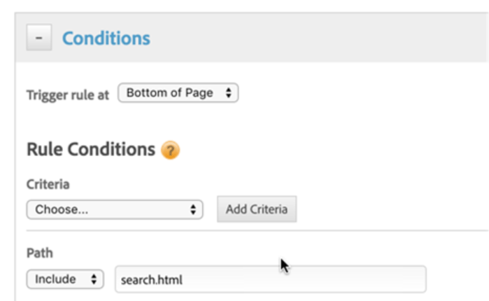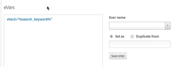 在下列使用案例中,您在 evar2, ​中擷取的搜尋關鍵字以及在Analytics中作為購買事件的產品購買。以下流程是根據AA呼叫轉送至AAM的伺服器端。在搜尋頁面上,您擷取"q"引數,並將其放入資料元素中: 此外,您將此專案新增至頁面載入規則,在其中在​ evar2 ​中新增搜尋關鍵字: 然後,您也會在感謝頁面上的分析中擷取 purchase 事件: 此時,我們能夠追蹤您,並可以在Audience Manager中建立區段。此外,我們已確定Audience Manager和Campaign皆會收集具有相同CRM_ID的使用者。​9. 根據使用者行為在AAM中建立區段