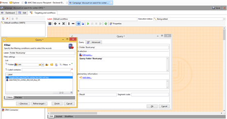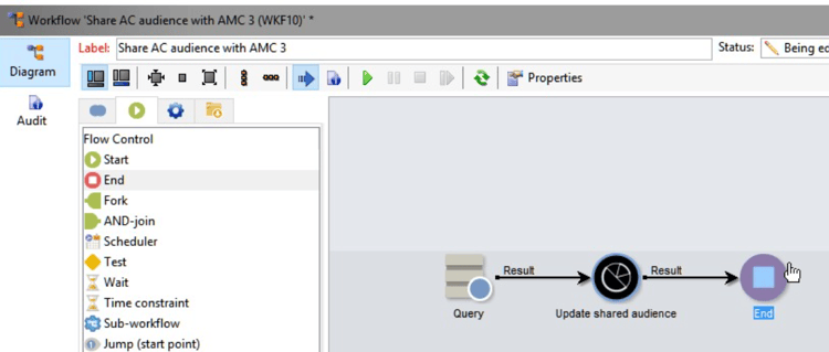 在促銷活動UI的 管理 功能表選項下,選取生產,然後移至技術工作流程。按一下新的技術工作流程、拖曳查詢、更新共用對象,然後結束。連按兩下查詢並加以編輯,以選取共用的對象和資料來源。 在AMC中建立區段。 建立後,這些區段會自動顯示在AAM UI中的 特徵 下,然後移至所有特徵,再移至Adobe Campaign特徵 在Adobe Campaign中執行工作流程,將區段傳送至AMC。完成稽核後,請核取之。 ​12. 傳送電子郵件給使用者在行銷活動中,首先根據對象建立清單。 這在 清單 中: 快顯視窗現在可讓您選取Marketing Cloud對象。選擇​search_for_winter_did_not-buy 在行銷活動工作流程中,您現在可以選取此清單並傳送目標電子郵件: ​測試建議您使用AAM中的測試區段來執行範例工作流程,以檢查整合是否可端對端運作。常見問題集* 在AAM UI中建立資料來源時,應使用哪些設定?下列設定將分別用於宣告ID和MID資料來源。整合代碼無法變更為任何其他值,否則客戶可能會產生額外成本。宣告的識別碼 MID * 如果您在 清單 下沒有 建立共用對象 選項,可能是什麼原因?您可能尚未使用Adobe ID登入Campaign。如果您使用Adobe ID登入,請確定您已新增至Marketing Cloud Enterprise Console UI中的對象庫產品。* 您已與AAM共用區段,但在AAM UI中尚未看到該區段。 原因可能是什麼?工作流程執行後,可能需要12-24小時才能將資料擷取到AAM,而另外可能需要24-48小時才能在AAM UI中更新報表。如果您在AAM UI中的特徵/區段底下沒有看到數字,即使是在3天後,請聯絡您的AAM顧問。最佳實務​1) 建議AAM與Campaign顧問共同完成設定。 2) 建議使用記錄有限的區段來端對端測試整合。 3) 切勿從AAM UI將區段對應至Campaign目的地​。