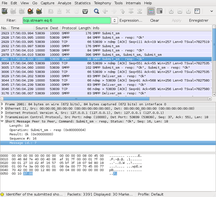 在SMS-C的連線埠上使用顯示篩選器。 例如,如果SMS-C使用連線埠10000,請使用以下篩選器: