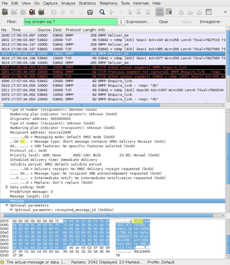 在上面的熒幕擷圖中,您可以看到訊息欄位中的使用者資料標題(1)、UDH中包含的資訊(2)以及一些不屬於封包但由Wireshark計算的其他資訊(3):短訊息正文欄位尤其有趣,因為它包含由Wireshark重新組裝的完整訊息。