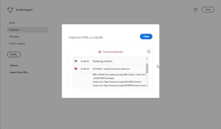 將含有HTML檔案和影像的.zip檔案匯入Email Designer時,發生下列錯誤: