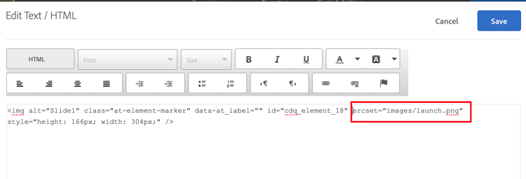 按一下「展開選取範圍」功能表,並取代HTML程式碼中的srcset屬性值,嘗試在父HTML上使用編輯容器動作。
