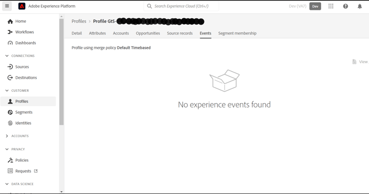 使用AEP Web SDK可在「事件」標籤下檢視設定檔資料。