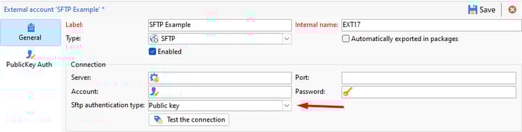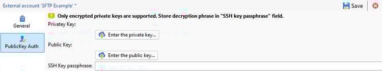 不過,有個因應措施。 檔案傳輸工作流程活動是以FTP/SFTP外部帳戶設定,且可由金鑰式驗證方法支援。