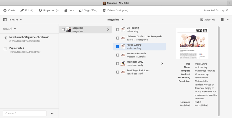 - 選取現有頁面並採取行動;例如,編輯、開啟 屬性、鎖定、複製、貼上 和 刪除