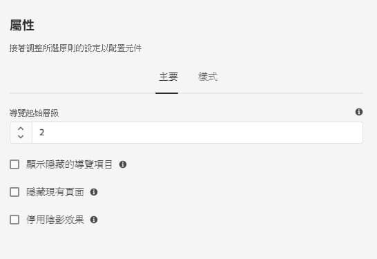 導覽開始層級 - 當階層連結元件新增至頁面時,此項目用於定義階層連結元件在階層中開始向下導覽至目前頁面的起始位置預設值。