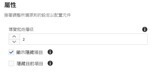開始導覽層級 - 將階層連結元件新增至頁面時,此項目用於定義階層連結元件在階層中開始向下導覽至目前頁面的起始位置預設值。