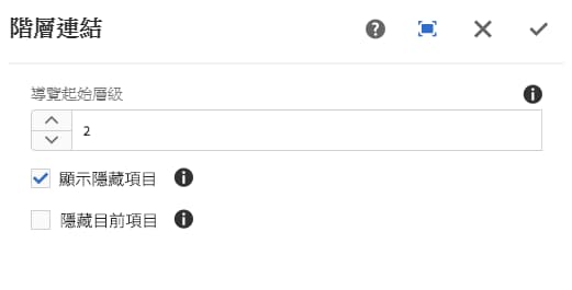 編輯對話框可讓內容作者在階層連結中隱藏已隱藏和作用中的頁面,以及應顯示的階層深度。