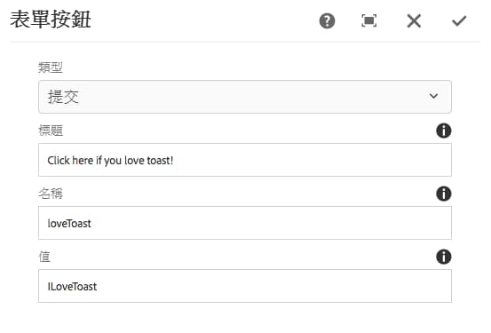 利用核心元件表單按鈕元件,您可在表單中包含按鈕欄位以觸發動作。