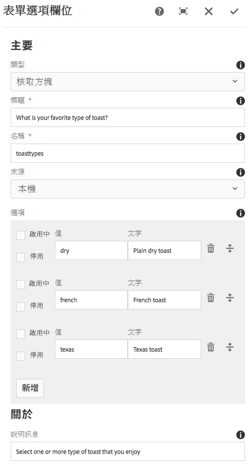 設定對話框可讓內容作者定義應呈現的選項類型、標籤以及可用的選項。