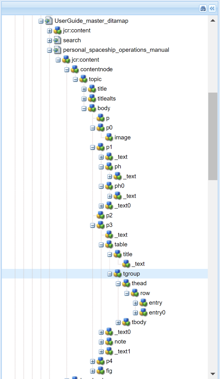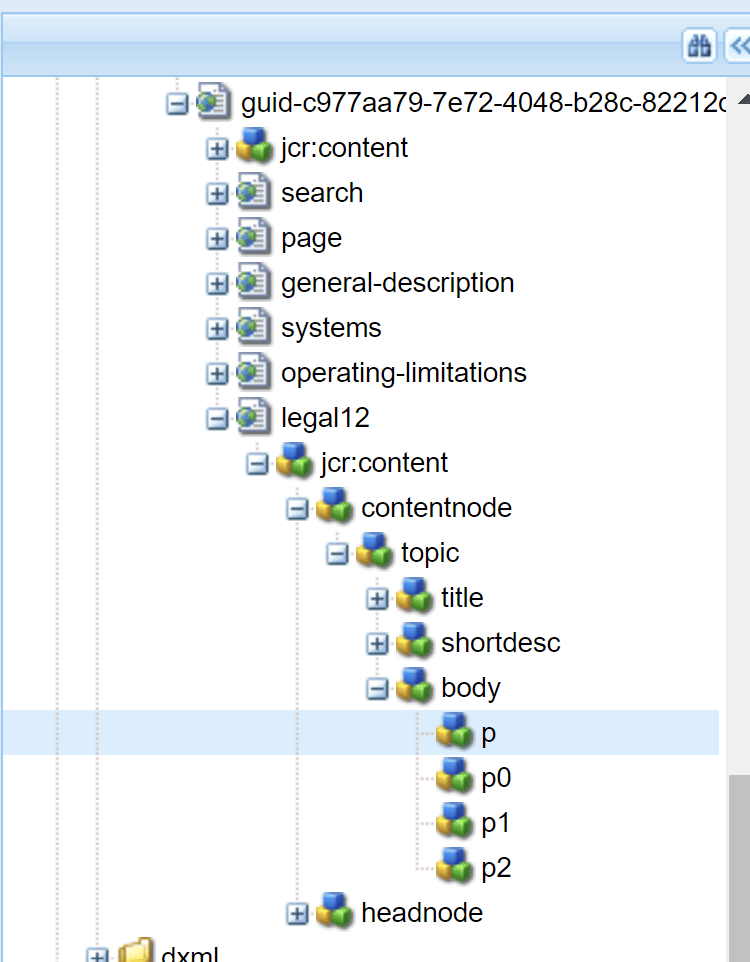 產生AEM Site輸出時,主題中每個元素的節點都會在內部建立。 對於包含數千個主題的DITA map,此節點結構可能會變得太深。 對於較大的網站,這種深度巢狀節點結構可能會出現效能問題。 下列快照會顯示AEM網站輸出的深度巢狀節點結構: