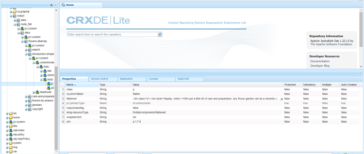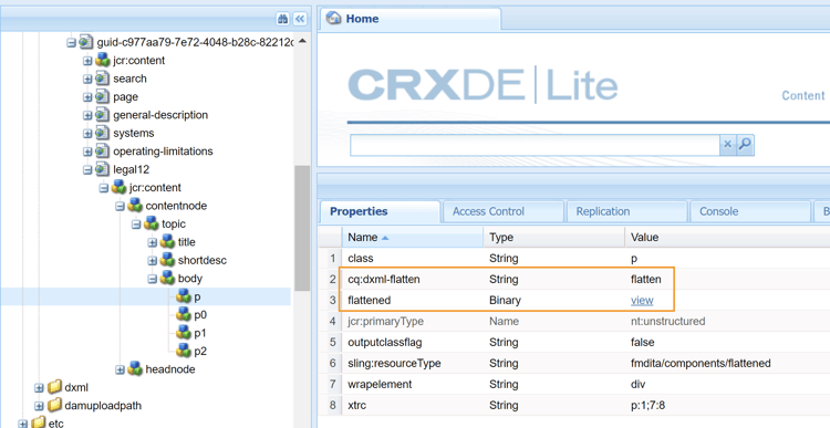 現在,當您產生AEM Site輸出時,p元素內的節點會平面化並儲存在p元素本身中。 您可以在CRXDE中找到p元素的新平面化屬性。