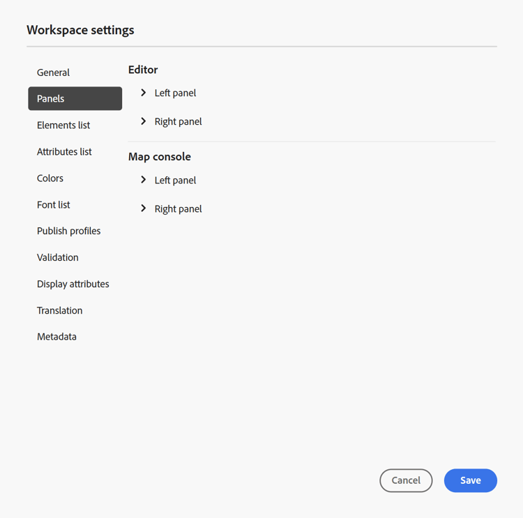 此設定會控制「編輯器」和「地圖」主控台左右面板中顯示的面板。 您可以切換按鈕,以顯示或隱藏所需的面板。