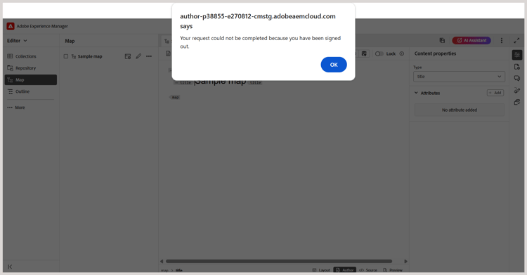 現在,當Adobe Experience Manager工作階段過期且您因非使用狀態而登出時,快顯訊息會通知您。 在工作階段結束後,當您嘗試在Experience Manager Guides中編輯內容時,會觸發此訊息。 此功能有助於降低遺失未儲存工作的風險,並提升體驗的整體可靠性和流動性,即使在閒置期間亦然。