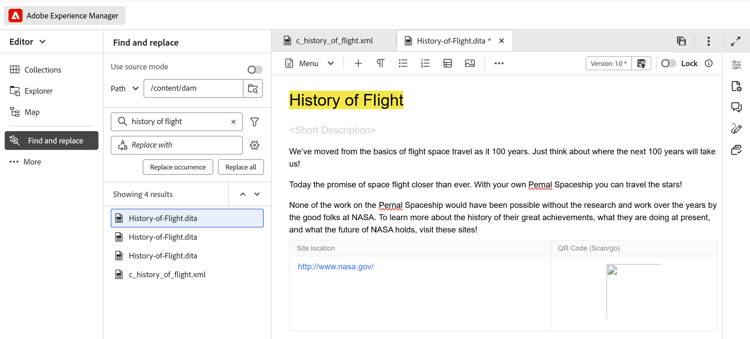 編輯器為搜尋文字提供了增強的篩選器。 您可以在Adobe Experience Manager存放庫所選路徑上存在的檔案中搜尋和篩選文字。 它會搜尋檔案中的標題、檔案名稱和內容。