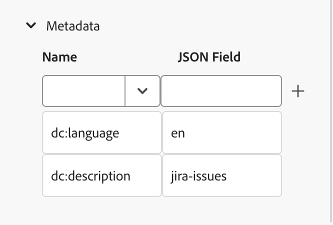 dc:description、dc:language、dc:title和docstate是您可以定義值的預設屬性。 您可以建立自訂屬性(如author)並定義其值。 {width="300"}