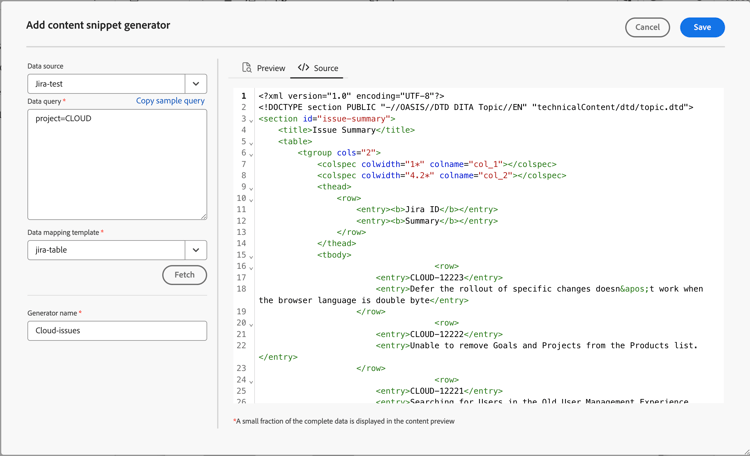 Adobe Experience Manager Guides提供與您的資料來源連線的功能。 您可以擷取資料、將其插入主題並進行編輯。 您可以使用內容片段產生器輕鬆建立內容片段,並在主題中重複使用。